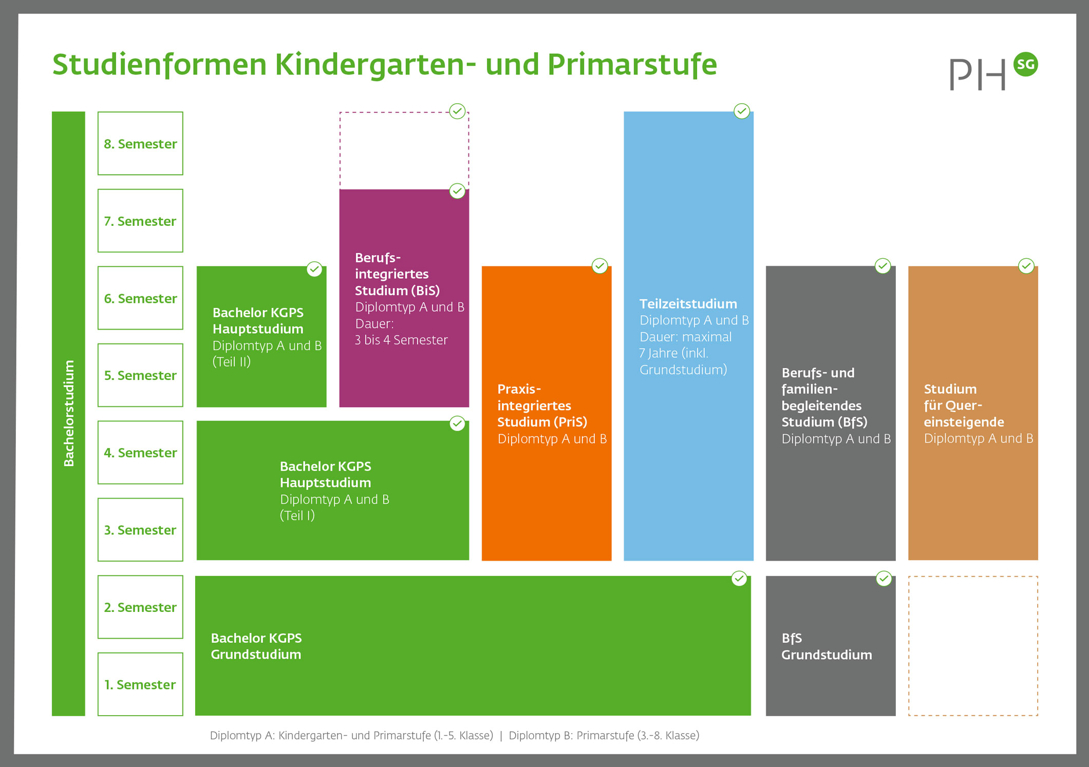 Das Ziel beider Studiengänge ist eine enge Verknüpfung des Studiums mit der Berufstätigkeit, damit die Studierenden vom starken Praxisbezug profitieren können. Die neuen Studienformen sind eine mittelfristige Massnahme gegen den Mangel an Lehrpersonen. Damit wird Menschen mit unterschiedlichen Bildungshintergründen und in verschiedenen Lebenssituationen das Studium an der PHSG ermöglicht.