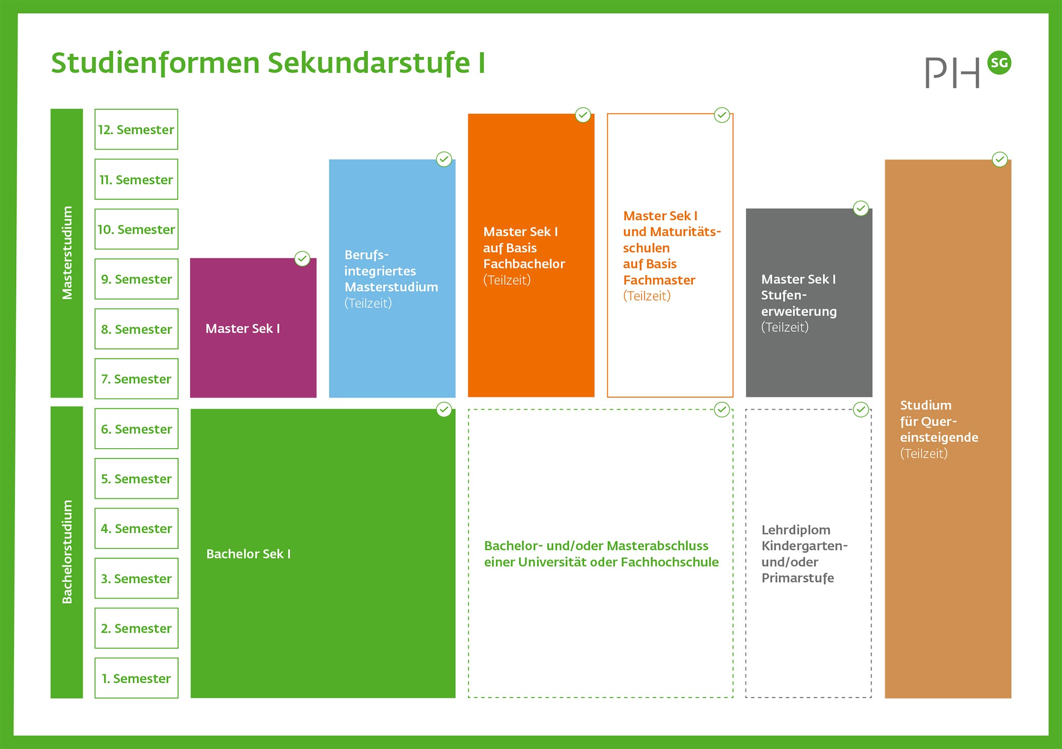 Der Studiengang für Quereinsteigende auf Sekundarstufe I kann von Beginn an berufsbegleitend absolviert werden. Ab dem 2. Studienjahr nehmen die Studierenden eine begleitete Teilzeitanstellung an einer Oberstufenschule an. Bereits erbrachte Studienleistungen können angerechnet werden, wodurch sich der Studienumfang reduziert. Die Dauer des Studiums hängt vom Umfang der Berufstätigkeit während des Studiums ab. In der Regel wird das Studium zwischen 9 und 13 Semester dauern.